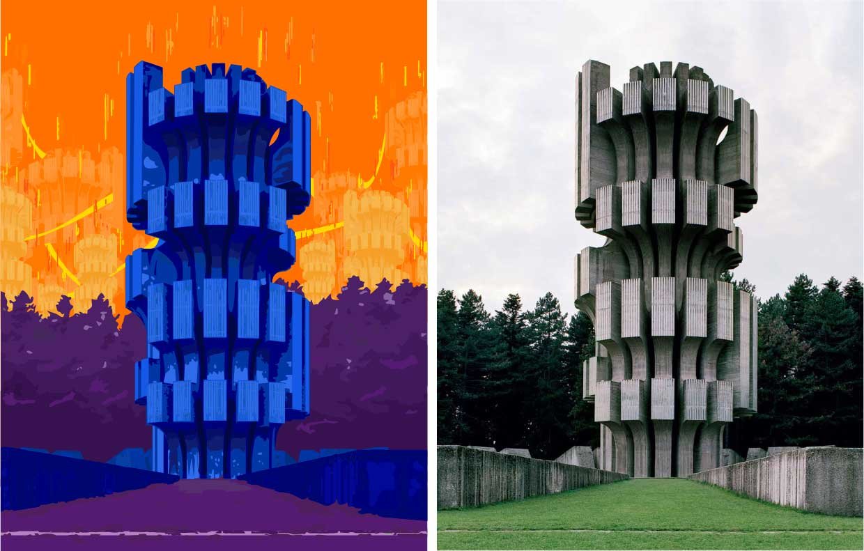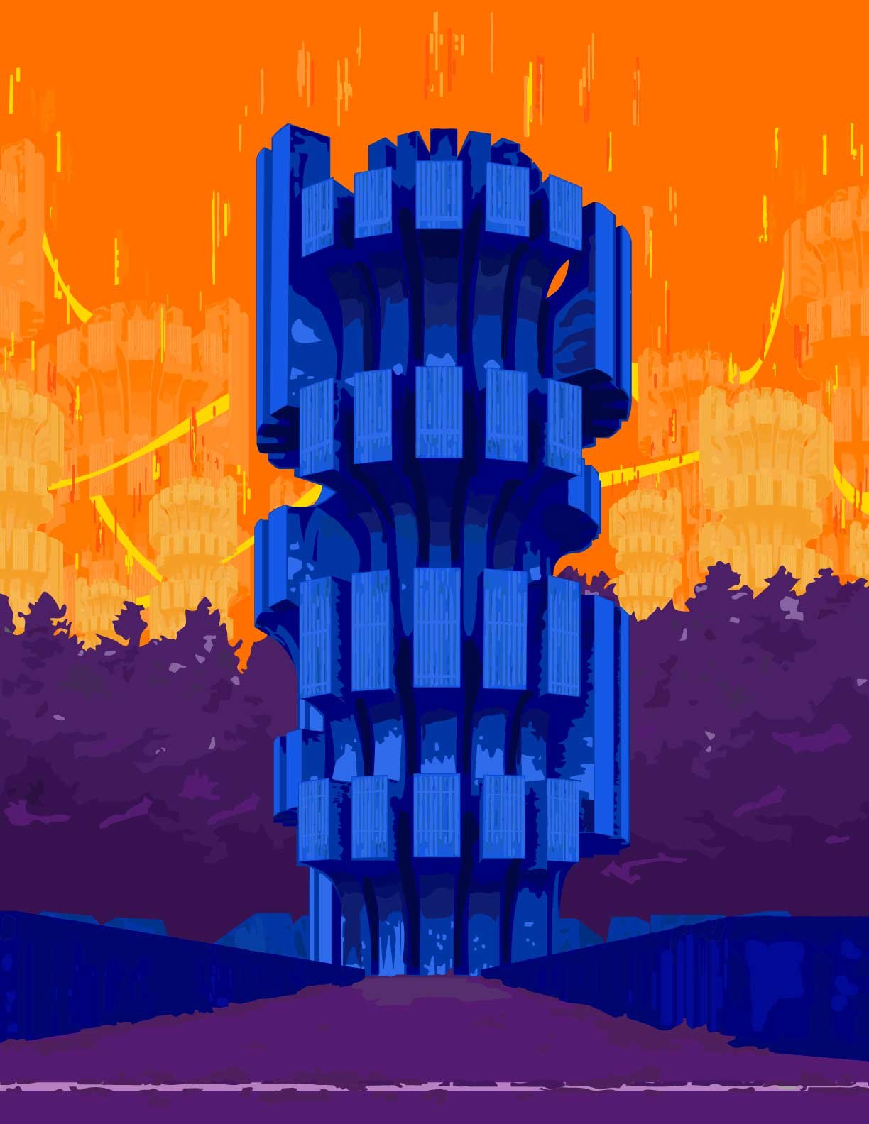 This personal project involved creating a digital illustration of the Monument to the Revolution "Mrakovica" (Spomenik Slobode). The illustration was then creatively adjusted to fit a future dystopia concept, incorporating unrealistic elements and vibrant pop colors. This project allowed me to explore a blend of architectural illustration and imaginative, conceptual design using Adobe Illustrator.