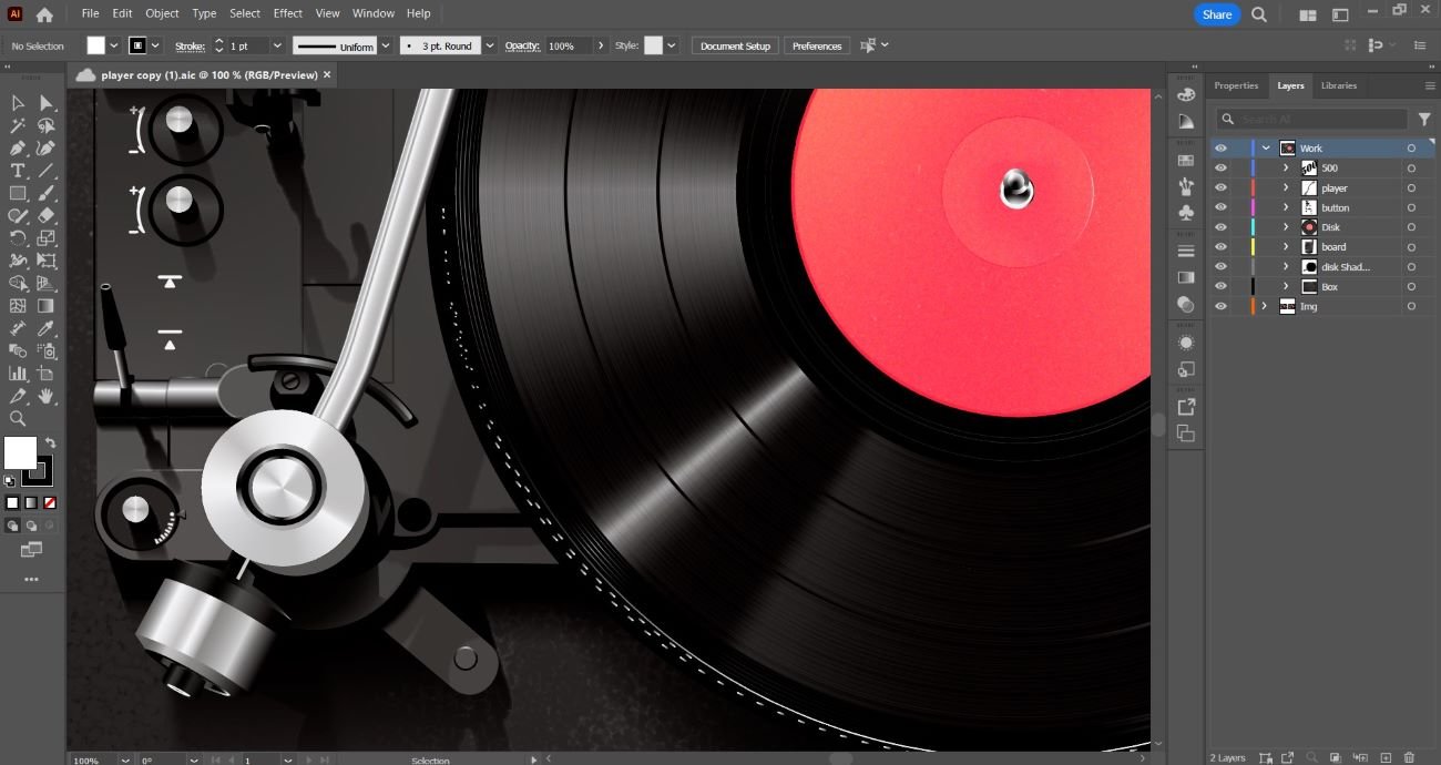 This personal project involved creating a highly detailed digital illustration of a record player, designed to resemble a real photograph. Using Adobe Illustrator, I focused on mastering brush techniques, and applying shadow, light, and gradient effects to achieve a lifelike appearance. The project was an exercise in enhancing my skills in digital illustration, emphasizing realistic rendering and attention to detail.